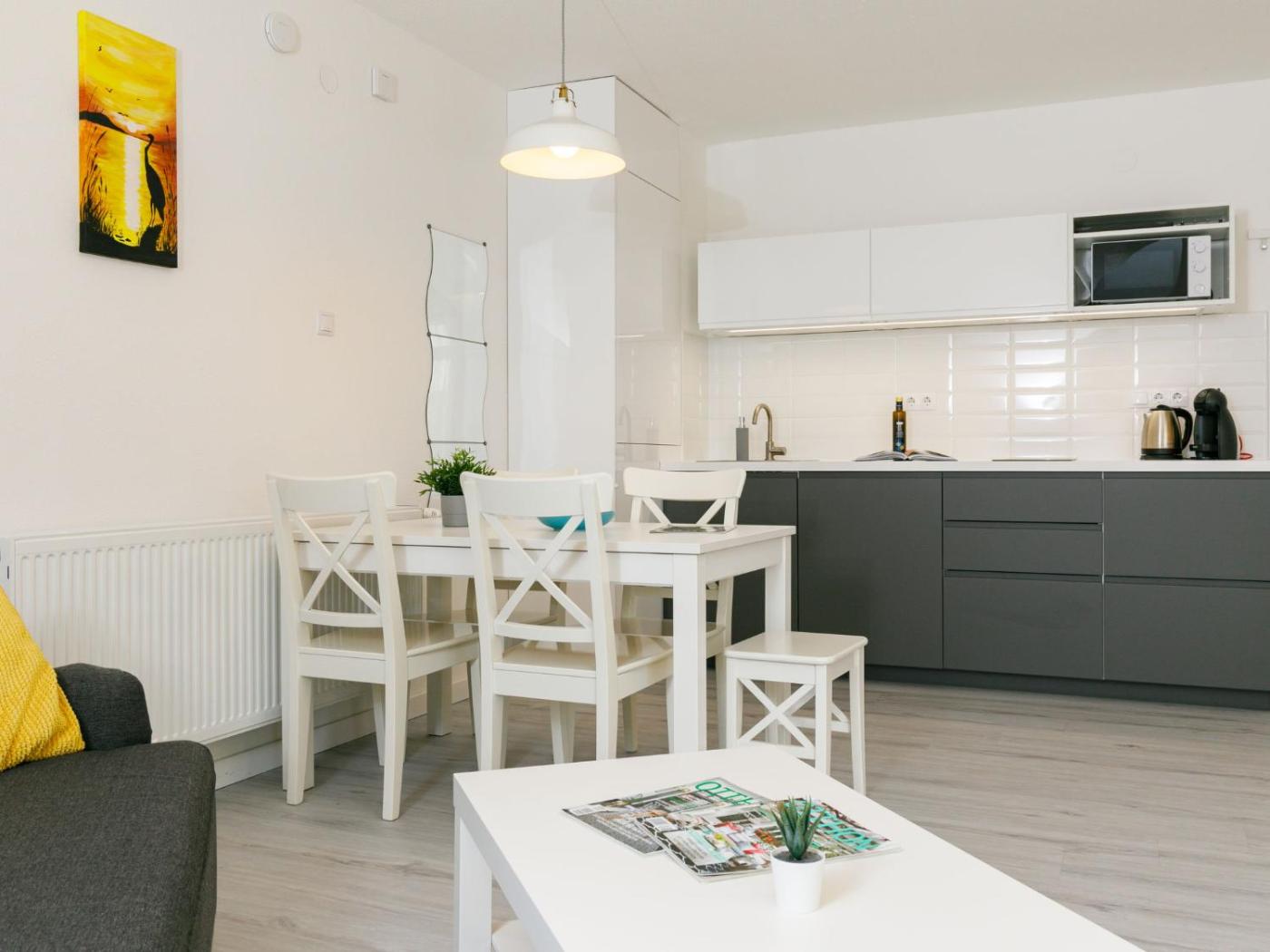 Apartment. This air-conditioned apartment consists of 1 living room, 1 separate bedroom and 1 bathroom with a bath or a shower. The fully equipped kitchen features a stovetop, a refrigerator, kitchenware and an oven. This apartment comprises a dining area, a TV with cable channels a coffee machine and a balcony. The unit offers 3 beds.