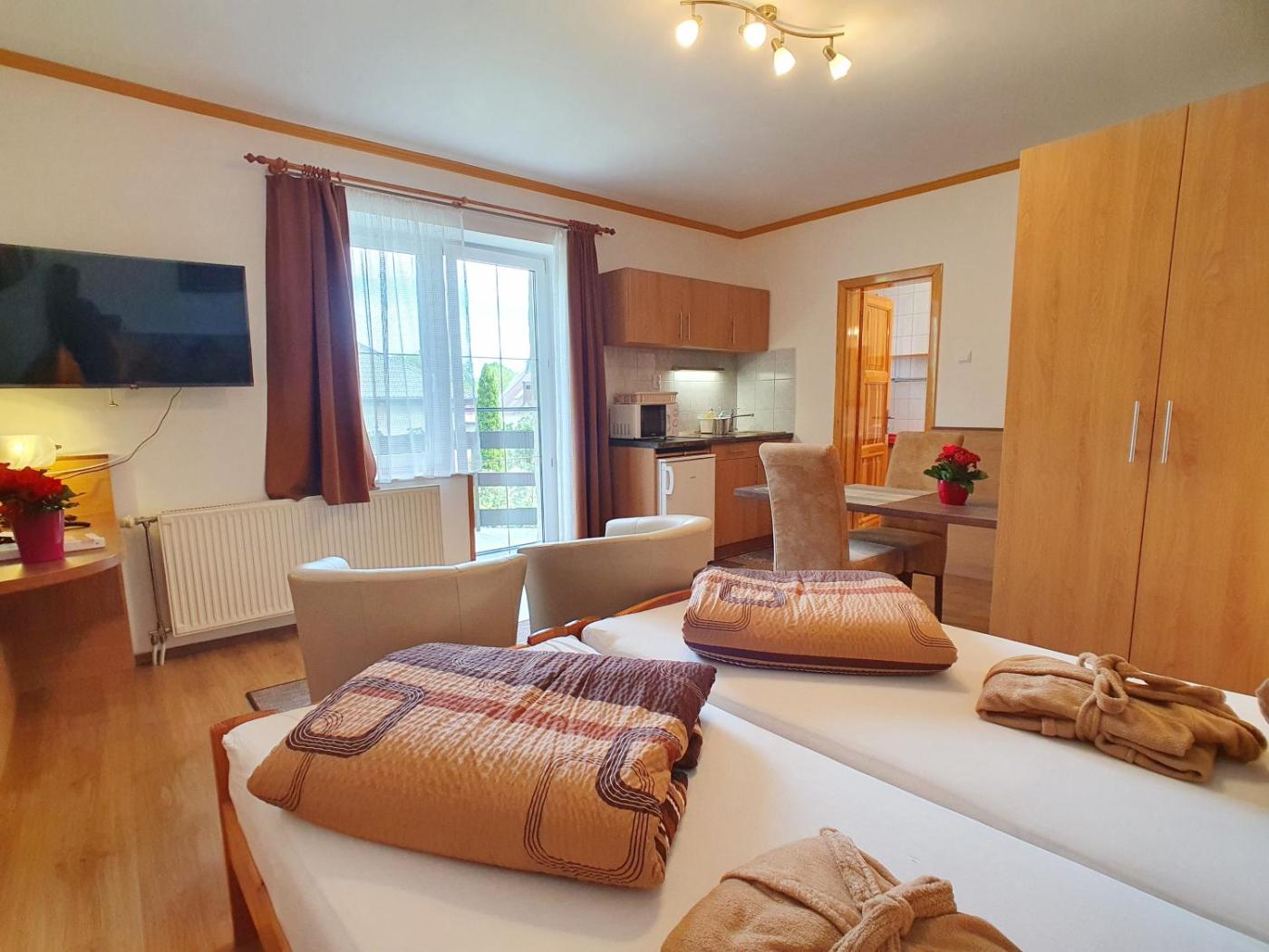Studio. Spacious, featuring a well equipped kitchenette. Some of the studios have a balcony. Guests can benefit from the extra towel and swimming belt provided for the lake visit. Daily cleaning and daily change of towels are available upon request. ;